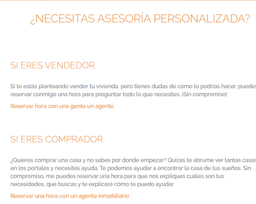Por ejemplo: si una sección de tu página web es «Qué tipos de casas te puedes encontrar en primera línea en Marbella» el call to action final puede ser: «Estas son las mejores casas que vas a encontrar en primera línea» y que lleve al cliente a un listado de inmuebles (que hayas filtrado previamente desde tu buscador de la web) que sean pisos en primera línea de playa. De este modo estás enlazando el contenido de la sección con tu producto, que son inmuebles en Marbella y tienes más posibilidades de conseguir una venta.