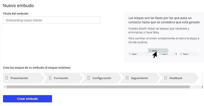 Lo primero es definir los pasos del embudo que va a seguir un nuevo cliente cuando contrata el servicio. En este caso van a ser 5